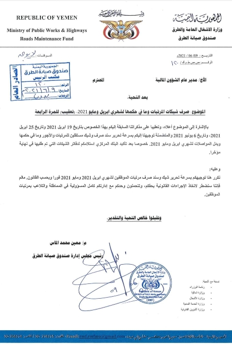 تعرف حقيقة عدم صرف رواتب موظفي صندوق صيانة الطرق والجسور في عدن كشفت وثيقة حقيقة رفض معين الماس رئيس مجلس ادارة صيانة الطرق صرف رواتب الموظفين.وأوضحت الوثيقة طلب مع...