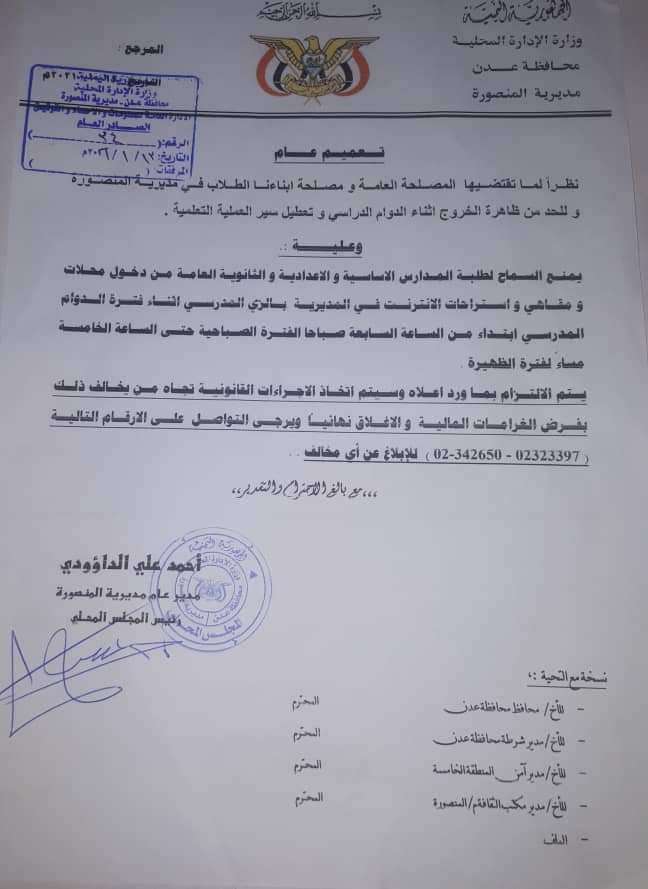 أصدر مدير عام مديرية المنصورة، أحمد علي الداؤودي، تعميم هام لجميع محلات ومقاهي إلانترنت بالمديرية، جاء في نصه: