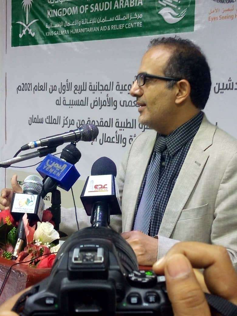 مشيدا بالتعاون الوثيق القائم بين المركز و وزارة الصحة العامة والسكان ومؤسسة البصر الخيرية العالمية، هذا وكان مدير مستشفى مكة والعضو الإداري المنتدب في مؤسسة البصر الخيرية العالمية بعدن حسام الدين عوض قد القى كلمة رحب فيها بالحاضرين وأشار فيها إلى الانجازات التي قام بها مركز سلمان لتقديم البر امج المختلفة لاسيما برنامح مكافحة العمى وإزالة المياه البيضاء وزرع العدسات مجانية للالاف من المواطنين المحتاجين.