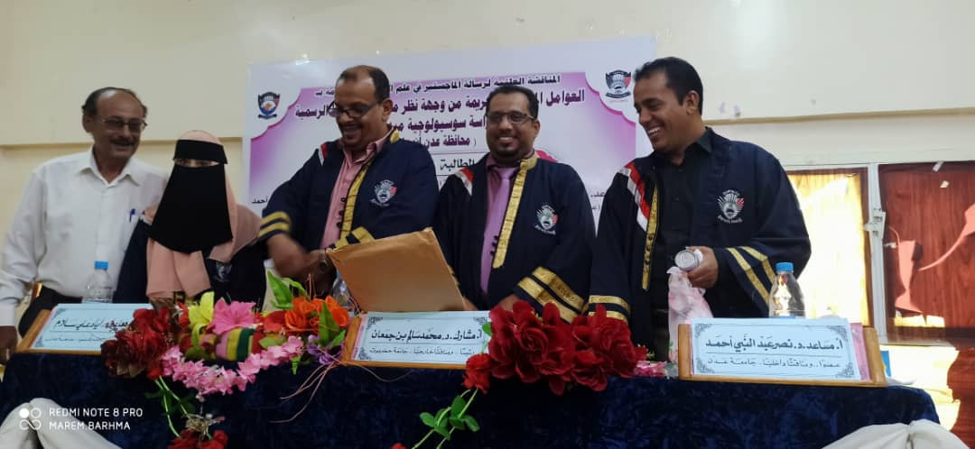 حصدت الباحثة " سماح سالم أحمد " درجة الماجستير بامتياز في علم الاجتماع على دراستها الموسومة ب: " العوامل المؤثرة في الجريمة من وجهة نظر مؤسسات الضبط الرسمية :دراسة سوسيولوجية ميدانية "محافظة عدن أنموذجاً"،