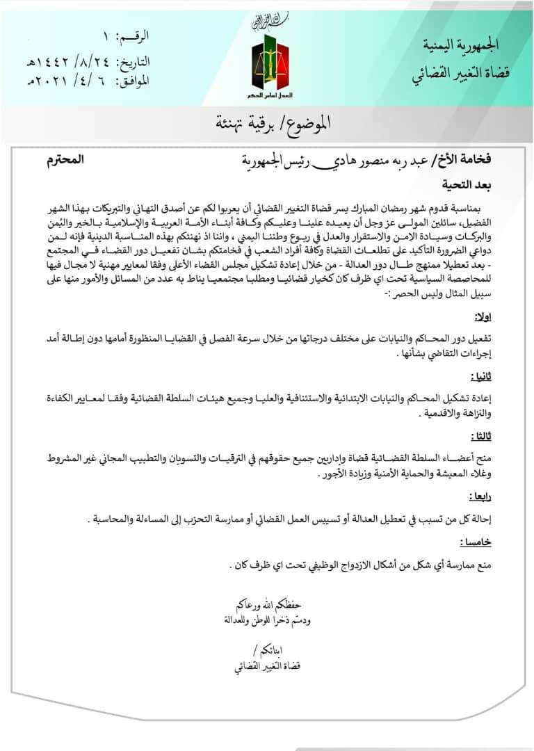 بمناسبة قدوم شهر رمضان المبارك يسر قضاة التغيير القضائي أن يعربوا لكم عن أصدق التهاني والتبريكات بهذا الشهر الفضيل، سائلين المولى عز وجل أن يعيده علينا وعليكم وكافة أبناء الامة العربية والإسلامية بالخير واليمن والبركات وسيادة الامن والاستقرار والعدل في ربوع وطننا اليمني ، واننا اذ نهنئكم بهذه المناسبة الدينية فإنه لمن دواعي الضرورة التأكيد على تطلعات القضاة وكافة أفراد الشعب في فخامتكم بشان تفعيل دور القضاء في المجتمع - بعد تعطيلا ممنهج طال دور العدالة - من خلال إعادة تشكيل مجلس القضاء الأعلى وفقا لمعايير مهنية لا مجال فيها للمحاصصة السياسية تحت اي ظرف كان كخيار قضائي ومطلب مجتمعي يناط به عدد من المسائل والأمور منها على سبيل المثال وليس الحصر :-