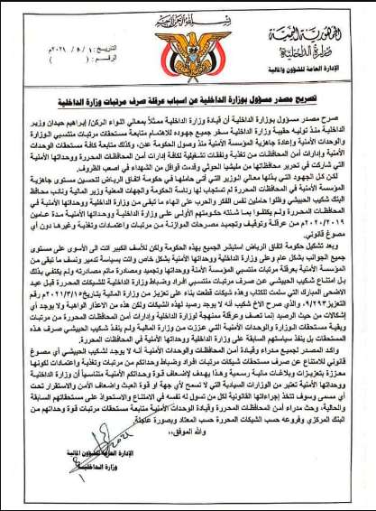 وجاء في الوثيقة التي وصفت بالمزورة والتي كانت صادرة عن الإدارة المالية التابعة لوزارة الداخلية الأسباب التي تقف خلف عرقلة صرف مرتبات منتسبي الوزارة، رغم التوجيهات الرسمية التي قضت بصرفها، كاشفة عن الجهات التي رفضت وتلكأت في صرفها وتتهم نائب محافظ البنك المركزي رفض صرف المرتبات .