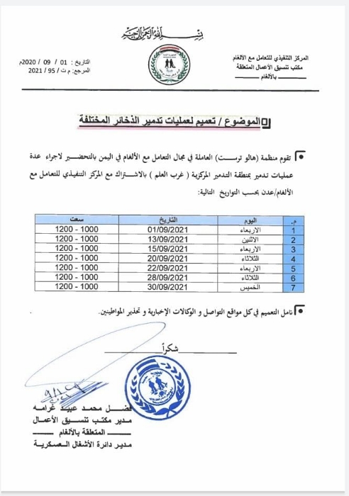 وستشترك المنظمة مع المركز التنفيذي للتعامل مع الألغام في اتلاف الألغام؛ فيما يتوجب على المواطنين عدم الخوف من التفجيرات كونه اجراء طبيعي للتخلص من مخلفات الحرب.