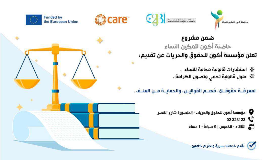 من خلال هذه الحاضنة، تسعى مؤسسة أكون ToBe للحقوق والحريات إلى تمكين النساء من معرفة حقوقهن وفهم القوانين والتمتع بالحماية القانونية من العنف، بما يعزز فرصهن في التكيّف والمساهمة الإيجابية في المجتمع. كما تعمل المؤسسة على نشر ثقافة الحقوق والحريات وتعزيز العدالة والمساواة، مستفيدة من مكانتها كمؤسسة حقوقية حاصلة على الصفة الاستشارية الخاصة لدى المجلس الاقتصادي والاجتماعي للأمم المتحدة.
