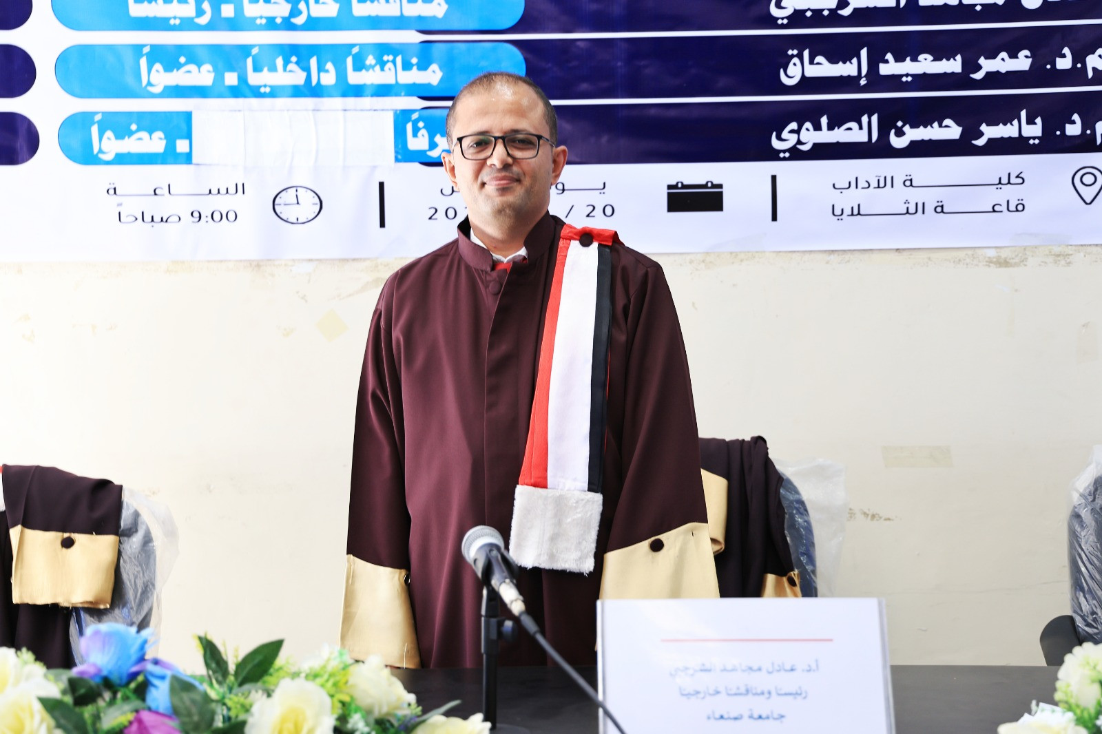 وتشكلت لجنة المناقشة من: الأستاذ الدكتور عادل مجاهد الشرجبي، أستاذ علم الاجتماع السياسي بجامعة صنعاء (رئيساً ومناقشاً خارجياً)، وأستاذ مشارك دكتور عمر إسحاق (عضواً ومناقشاً داخلياً)، وأستاذ مشارك دكتور ياسر الصلوي (عضواً ومشرفاً).