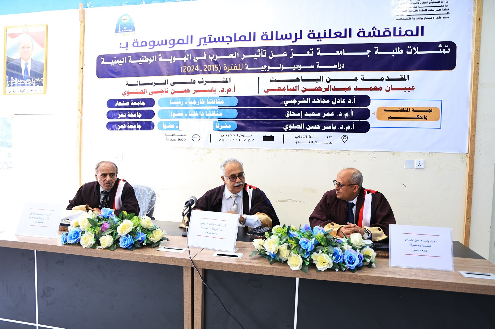 حصل الباحث عيبان محمد عبدالرحمن السامعي على درجة الماجستير في علم الاجتماع بتقدير امتياز من جامعة تعز، وذلك عن رسالته الموسومة بـ "تمثّلات طلبة جامعة تعز عن تأثير الحرب في الهُوية الوطنية اليمنية: دراسة سوسيولوجية للفترة (2015 – 2024)"