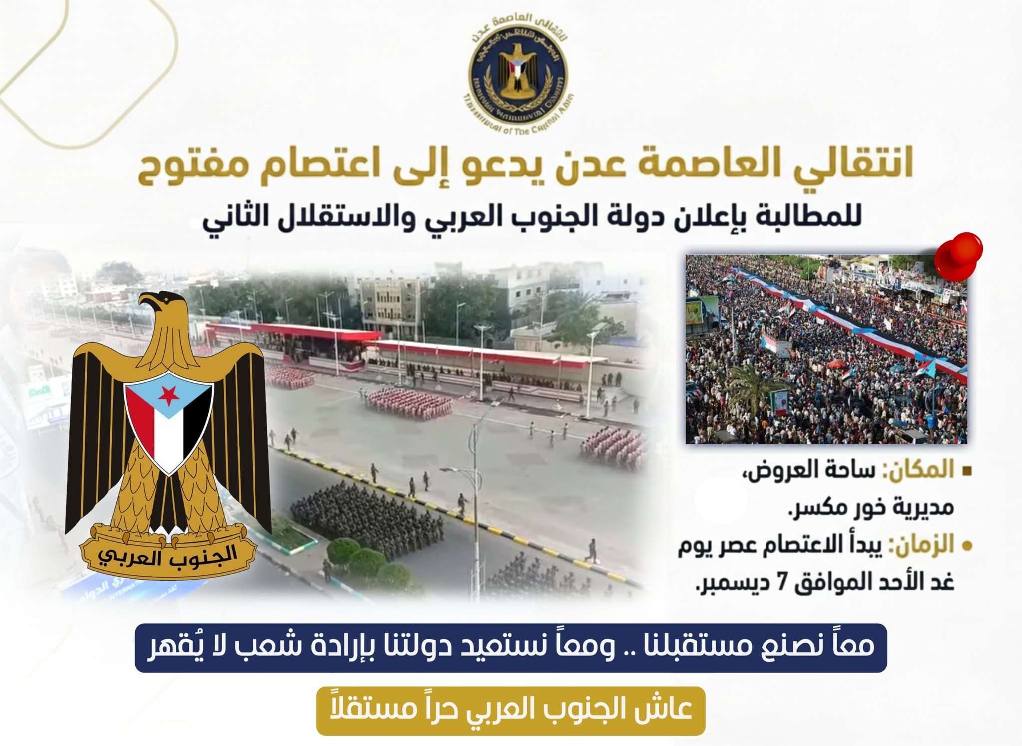 أعلن المجلس الانتقالي الجنوبي في العاصمة عدن عن تنظيم اعتصام جماهيري مفتوح في ساحة العروض بمديرية خور مكسر ابتداءً من عصر غد الأحد 7 ديسمبر، للمطالبة بإعلان الاستقلال الثاني للجنوب وتمكين الجنوبيين من إدارة أراضيهم وثرواتهم.