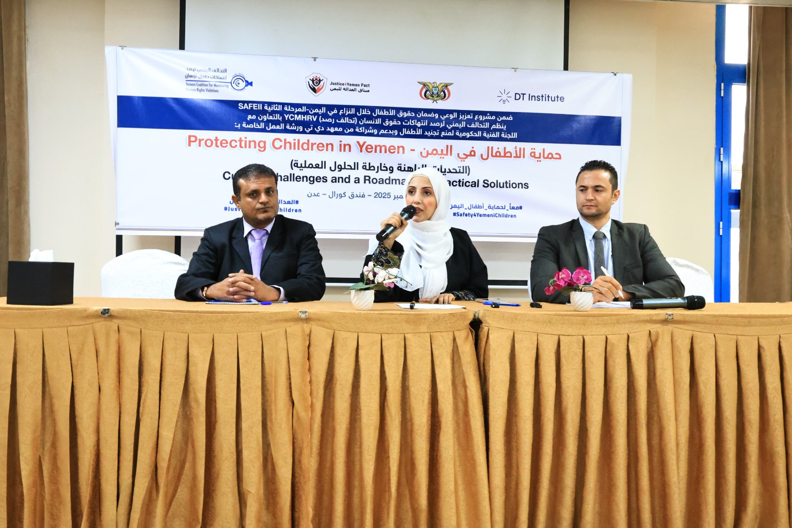 تحت عنوان: "حماية الطفل في اليمن: التحديات الراهنة وخارطة طريق للحلول العملية" وبرعاية وزير حقوق الإنسان، أقام التحالف اليمني لرصد انتهاكات حقوق الإنسان (تحالف رصد)، بالشراكة مع معهد DT، وبالتنسيق والتعاون مع اللجنة الفنية الحكومية المشتركة لمنع تجنيد الأطفال، وائتلاف العدالة من أجل اليمن، ورشة وطنية هي الثانية من نوعها حول حماية حقوق الطفل وذلك ضمن برنامج (SAFE II).