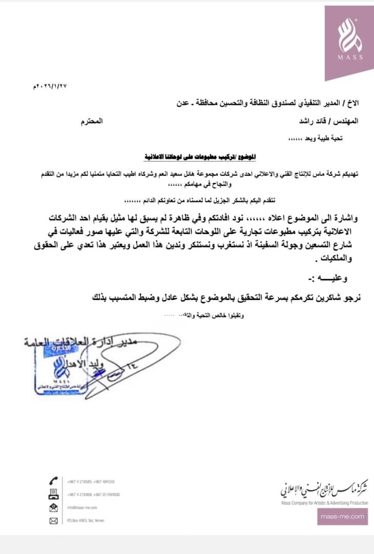 كشفت وثيقة رسمية صادرة عن شركة ماس للإنتاج الفني والإعلاني عن تعرض عدد من لوحاتها الإعلانية في محافظة عدن لتعدٍّ غير قانوني، تمثل في تركيب إعلان لمنتج كوستر كلاركس فوق اللوحات الأصلية، دون أي إذن أو تنسيق مسبق مع الشركة المالكة.