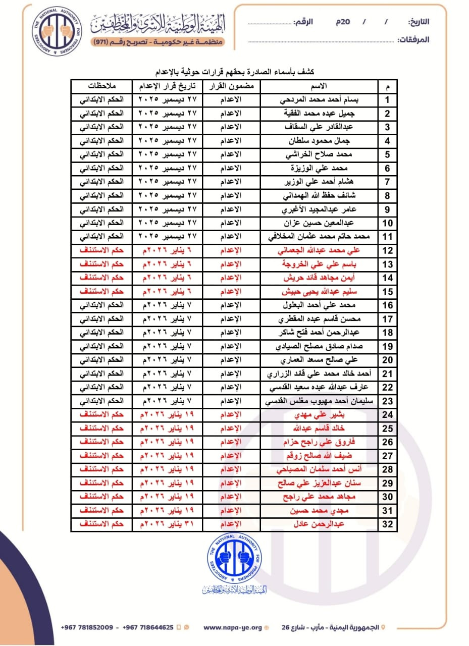 وأوضح البيان، أن أحكام الإعدام صدرت على أربع دفعات بين 27 ديسمبر 2025م، و31 يناير 2026م، أي بعد أيام فقط من توقيع اتفاق لتبادل الأسرى في مسقط (23 ديسمبر 2025م)، في خطوة تفسرها الهيئة بأنها "تحدّ سافر" للجهود الإنسانية و"كشف لنهج الجماعة الانتقامي".