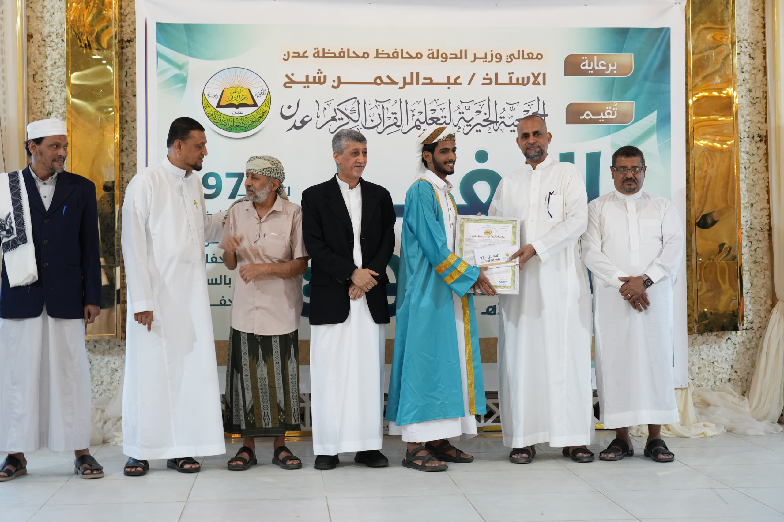 وشهد الحفل الذي أقيم في قاعة (قصر سبأ) و برعاية كريمة من معالي وزير الدولة محافظ محافظة عدن عبدالرحمن شيخ، تكريم (97) حافظ وحافظة لكتاب الله، منهم 7 حفاظ مجازون بالسند.