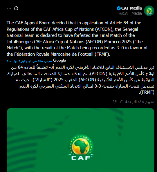أعلنت الاتحاد الإفريقي لكرة القدم، اليوم 17 مارس 2026، قبول استئناف الجامعة الملكية المغربية لكرة القدم وإلغاء قرار لجنة الانضباط، مع اعتبار منتخب السنغال منهزمًا في نهائي كأس أمم أفريقيا 2025 بالمغرب.