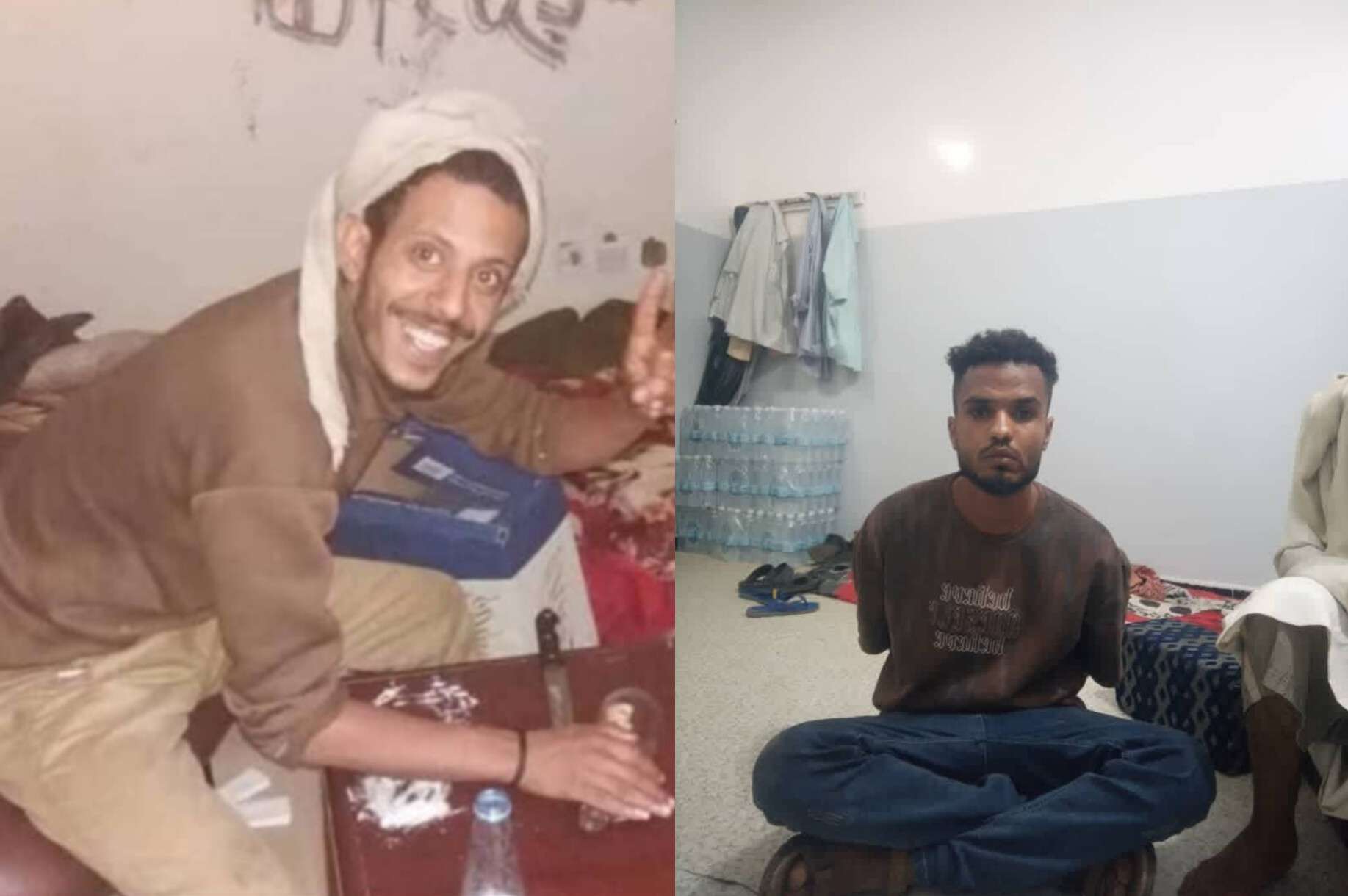 القاتل يظهر في يمين الصورة يرتدي تيشرت اسود ويداه للخلف، والضحية في يسار الصورة يرتدي قميص بني اللون.