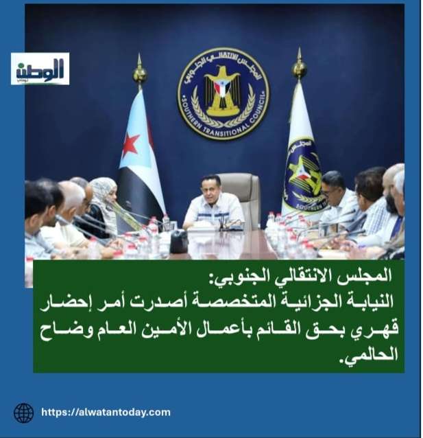 أعرب المجلس الانتقالي الجنوبي عن استنكاره لإصدار النيابة الجزائية المتخصصة أمر إحضار قهري بحق القائم بأعمال الأمين العام للمجلس، وضاح الحالمي، بناءً على توجيهات من النائب العام، معتبرًا الخطوة تصعيدًا يفتقر إلى مسوغات قانونية.