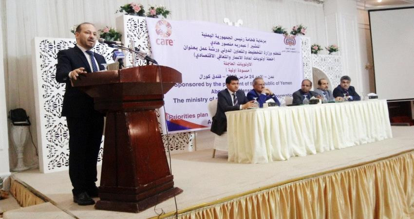 عقدت وزارة التخطيط والتعاون الدولي، صباح اليوم في العاصمة المؤقتة عدن، ورشة عمل فنية لمناقشة مسودة خطة الأولويات العاجلة لإعادة الإعمار والتعافي الاقتصادي، برعاية فخامة رئيس الجمهورية المشير عبد ربه منصور هادي.