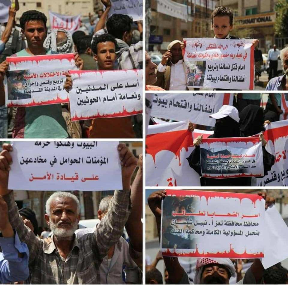 ورفع المتظاهرون شعارات منددة بالجريمة التي ارتكبتها مليشيا حزب الاصلاح تحت شعارات امنية، كما طالبوا محافظ تعز بإقالة واحالة القيادات العسكرية المشرفة على الحملة الى التحقيق .