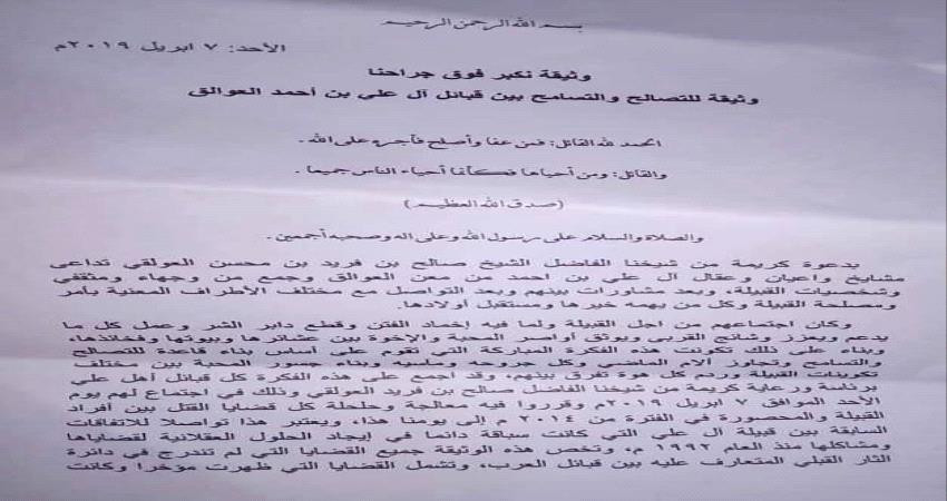 وثيقة للتصالح والتسامح بين قبائل آل علي بن أحمد العوالق