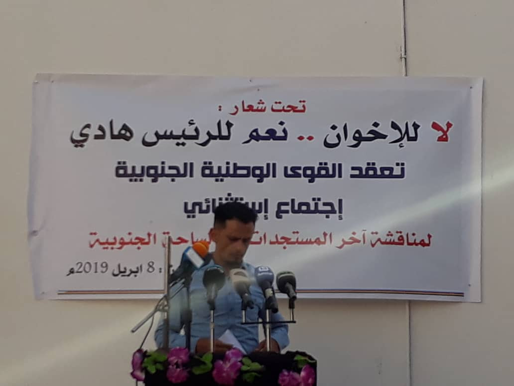 أعلن عدد من القيادات بالمقاومة الجنوبية تأييدهم للبيان الصادر عن الاجتماع الاستثنائي بالداخل الذي عقد عصر اليوم الاثنين الموافق ٨/٤/٢٠١٩م بمنزل المناضل أديب العيسي ورفض اشهار ما يسمى بالائتلاف الوطني الجنوبي بالعاصمة عدن الذي يهيمن عليه حزب الإصلاح.