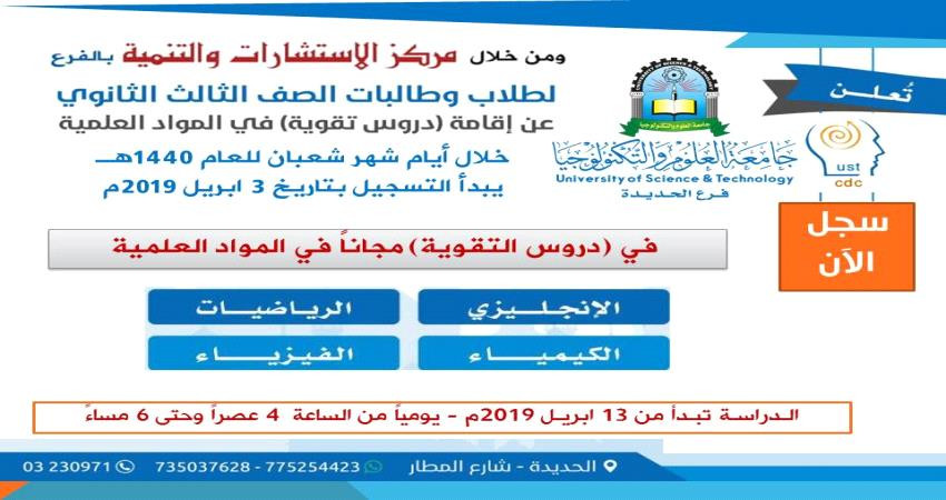 يدشن فرع جامعة العلوم والتكنولوجيا بمحافظة الحديدة السبت المقبل برنامج دروس تقوية في عدد من المواد العلمية لطلاب المرحلة الثانوية المسجلين بالبرنامج .