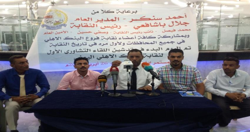 برعاية المدير العام للبنك الاهلي اليمني أحمد سنكر ورئاسة نقابة موظفي البنك ، دشن اليوم بالعاصمة المؤقتة عدن، اللقاء التشاوري الاول لنقابة البنك الاهلي اليمني، بمشاركة جميع فروع البنك بمحافظات الجمهورية ، وبحضور قيادة واعضاء النقابة.
